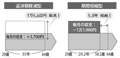 図解してみますね。「期間短縮型」で、毎月の自己負担額を変わらず1万1900円にするのであれば、約6年のローン期間の短縮になります。「返済額軽減型」なら、ローン期間は変わりませんが、毎月の収支がプラス3700円になります。これなら、毎月の支出を抑えることができます。