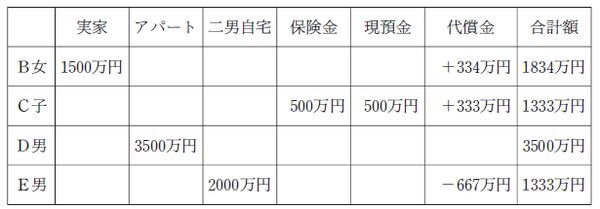 したがって、D男は1500万円と法定相続分の差額167万円を代償金として支払い、E男は、2000万円と法定相続分の差額667万円を代償金として支払うことになる。