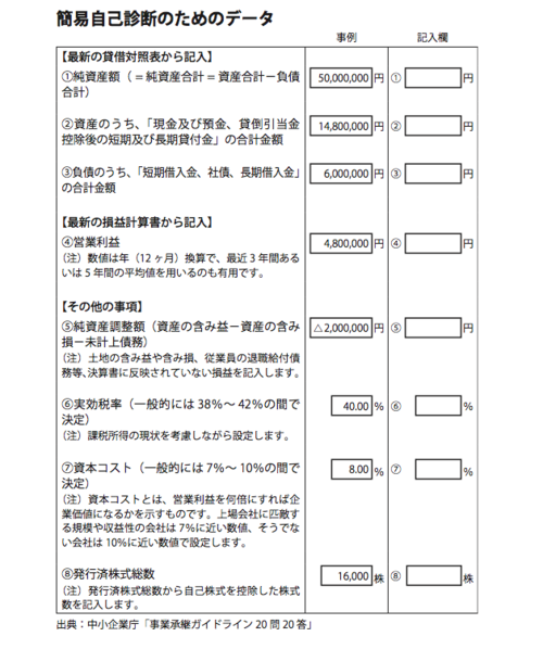 平成18年10月に中小企業庁が公表した『事業承継ガイドライン20問20答』のなかで、簡易に自己診断ができる方法として紹介されました。時価純資産法とDCF法の重要項目だけを抽出した算出法で、自社の決算書などを見ながら数値を記入していくと簡単に試算が出ます。