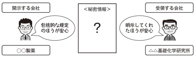 企業間の取引でやり取りされる秘密情報は、多岐にわたることが多いものです。そのため、細かく秘密情報を定めてしまうと秘密情報の範囲から外れてしまうことがあるから、多くの場合、包括的に定められることが多いと思われます。具体的には、「本契約の遂行により知り得た相手方の技術上または営業上その他一切の業務上の情報」等と規定されているような場合です。