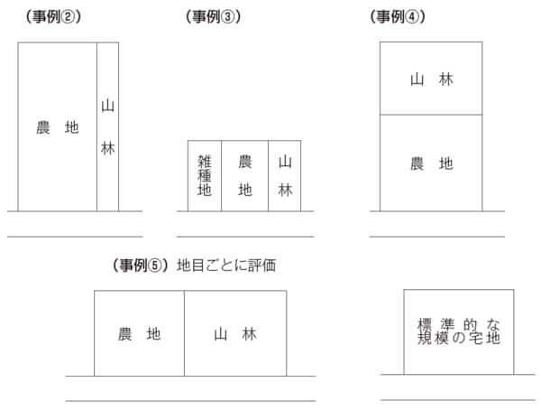 以下の事例①~④のような場合に、農地、山林及び雑種地の全体を一団として評価することが合理的と認められます。なお、事例⑤のような場合はそれぞれを地目の別に評価します。