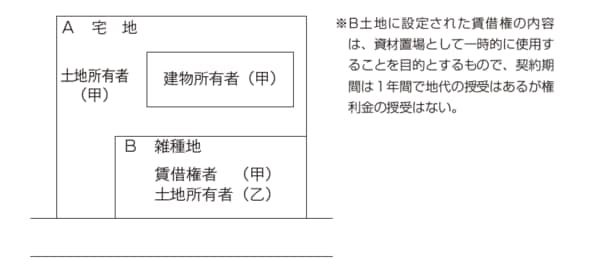 例えば、次の図のように、甲が、その所有するA土地に隣接するB土地を資材置場として一時的に使用する目的で、契約期間を1年として乙から賃借している場合は、A土地と一体としてB土地を利用していますが、その賃借権の契約期間が短いことによりその賃借権の価額を評価しないため、甲が所有する土地のみを1画地の宅地として評価します。