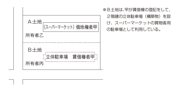 したがって、事例の場合、B土地は、スーパーマーケットの買物客用の駐車場としてA土地と一体として利用されていることから、A土地とB土地を一団の土地(宅地)として評価し、その価額をそれぞれの土地の地積の割合に応じて按分してA土地とB土地の価額を求め、A土地の価額に借地権割合を、B土地の価額に賃借権割合を、それぞれ乗じて甲の借地権の価額及び賃借権の価額を評価します。