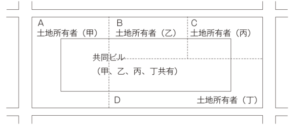 例えば、図表1のように甲、乙、丙及び丁の共同ビルの敷地の用に供されている宅地は、A、B、C及びDの土地全体を1画地の宅地として評価した価額に各土地の価額の比を乗じた金額により評価します。